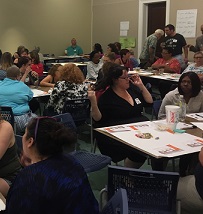 The event was created by: Suzanne Roberts, co-founder of Safe Conversations About Race; Dr. Maurice Stevens, Professor from the Department of Comparative Studies at The Ohio State University; and Mary Lou Langenhop. Participants began showing up half an hour before the event started and there was quite literally a line out the door of unregistered people hoping to be included. The three or four facilitators in charge of admission were almost overwhelmed by all the people, and the tight hallway soon filled with clamor. Eventually everyone was able to filter into the half-court sized auditorium, now strewn with small tables arranged all throughout the space. The racial makeup of the room, now seated, was diverse. However, there was a clear majority of women in the room. The age range was large but noticeably shifted towards the elderly.