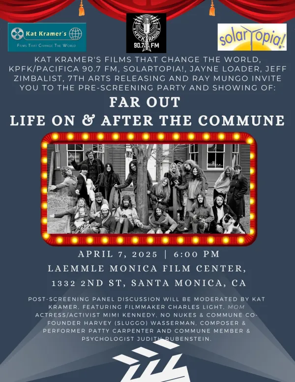 There will be panel discussions with filmmaker Charlie Light, Harvey Wasserman, and musician Patty Carpenter. The panels take place after the 10:00 a.m., April 5 show at Encino; the 10:00 a.m., April 6 show at Glendale; and the 7:00 p.m. screening at Santa Monica. The panel on April 7 also includes Mom actress/activist Mimi Kennedy and Judith Rubenstein, commune member and psychologist.