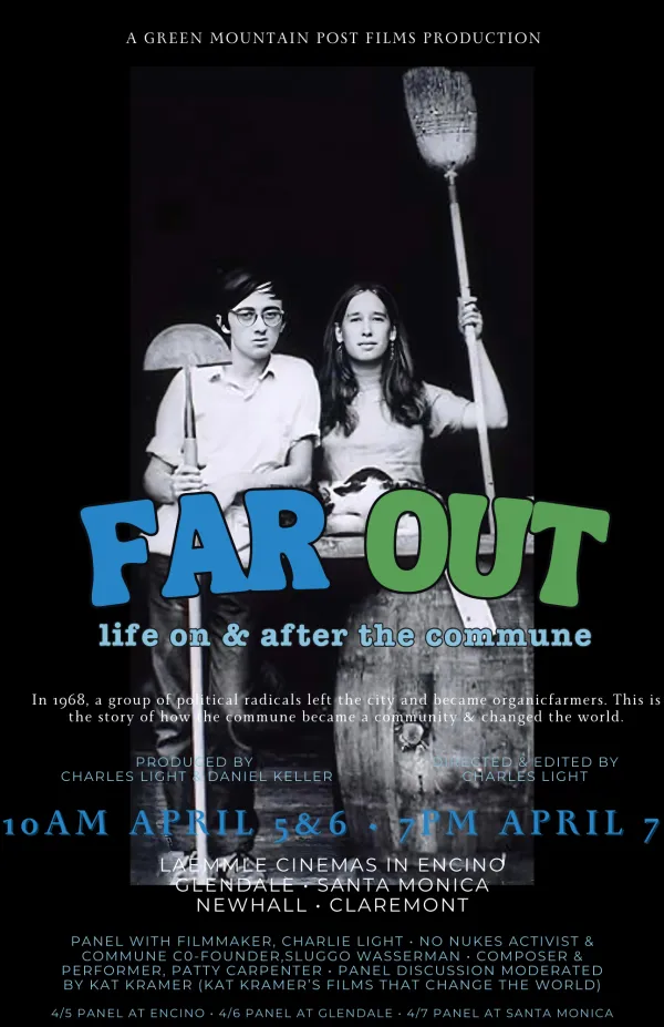 Far Out: Life On & After the Commune will be showing at five Laemmle venues in California (Encino, Glendale, Santa Monica, Claremont and Newhall) at 10:00 a.m. on April 5 and 6 and at 7:00 p.m. on April 7 as part of Laemmle Theatres’ Culture Vulture series.