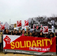 Lots of people at a march front ones holding a long red and white banner saying Solidarity Trumps Hate with a fist