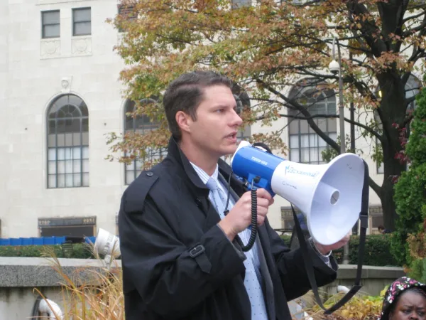 A member of Service Employees International Union (SEIU) Local 1, Rhynehardt was speaking on November 10 at a #FightFor15 rally on the steps of Columbus City Hall. It was one of 230 solidarity protests held across the U.S. as part of a national day of action. Fast food workers went on strike in 270 cities, demanding a $15 an hour wage and the right to join a union.