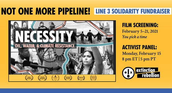 The movie , Necessity: Oil, Water, and Climate Resistance by filmmakers Jan Haaken and Sam Praus, highlights the work of Tara Houska and other Water Protectors who have been fighting Line 3. Please help spread the information about this fundraiser through all of your social media connections. _____ In addition, there will be a separate zoom educational webinar about the frontline resistance to Line 3 in Minnesota. The hope is to present a first-hand overview of the current Line 3 situation as well as gauge interest in car caravan pods of activists going to join them early spring.