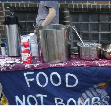 Table with pots and pans and banner saying Food Not Bombs