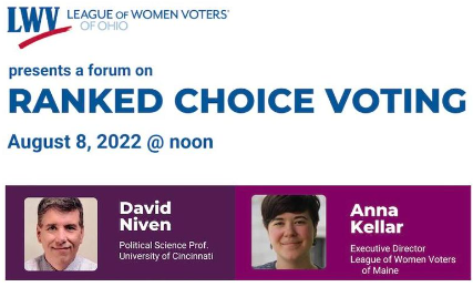 Join the League of Women Voters of Ohio on Monday August 8 at 12noon for a forum discussion on Ranked Choice Voting. Guests will discuss the basics of Ranked Choice Voting and its different forms, its benefits and challenges, implementation in cities and states across the nation, and its prospects in Ohio.