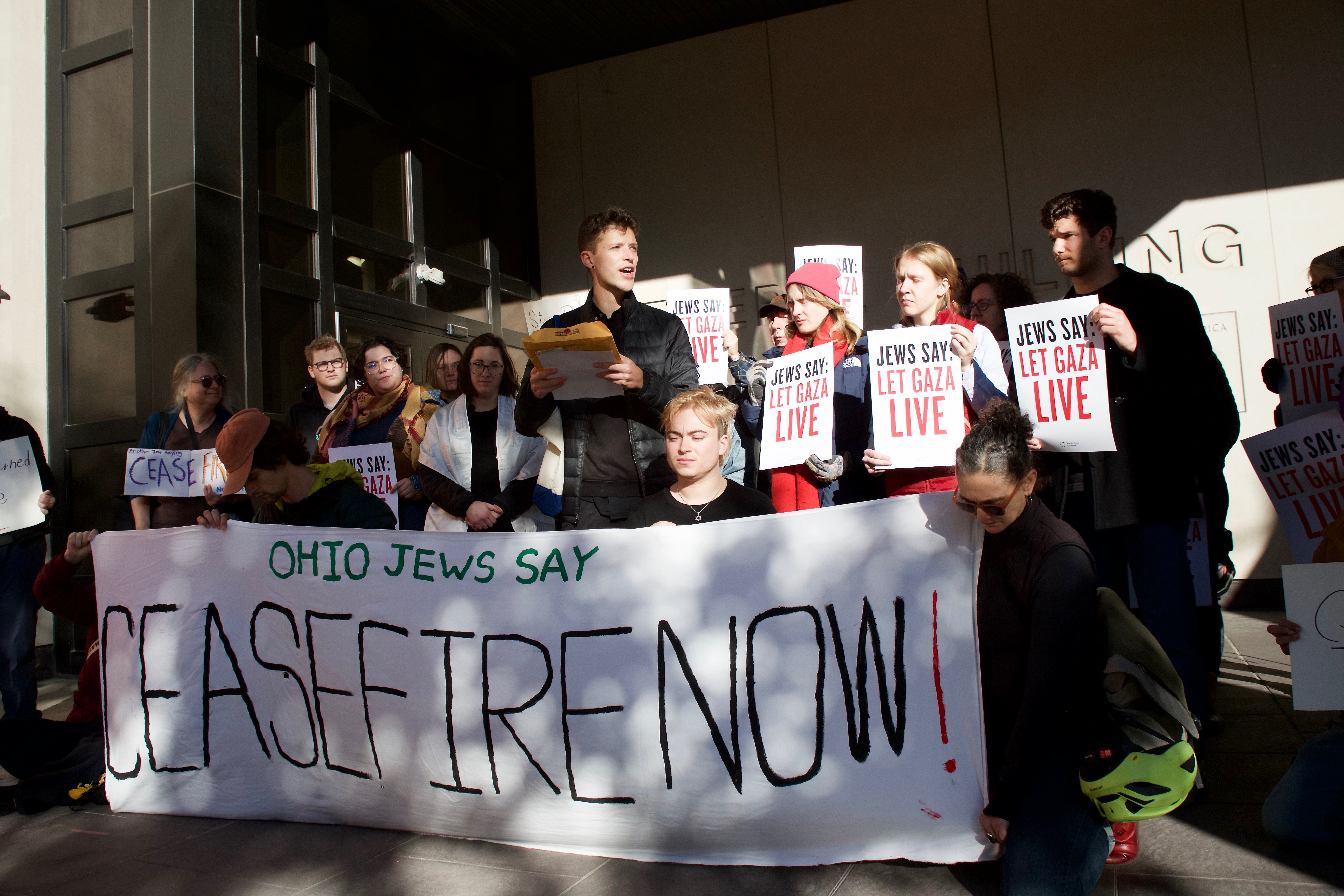 The local chapter of Jewish Voice for Peace protesting outside Brown's office calling for a ceasefire