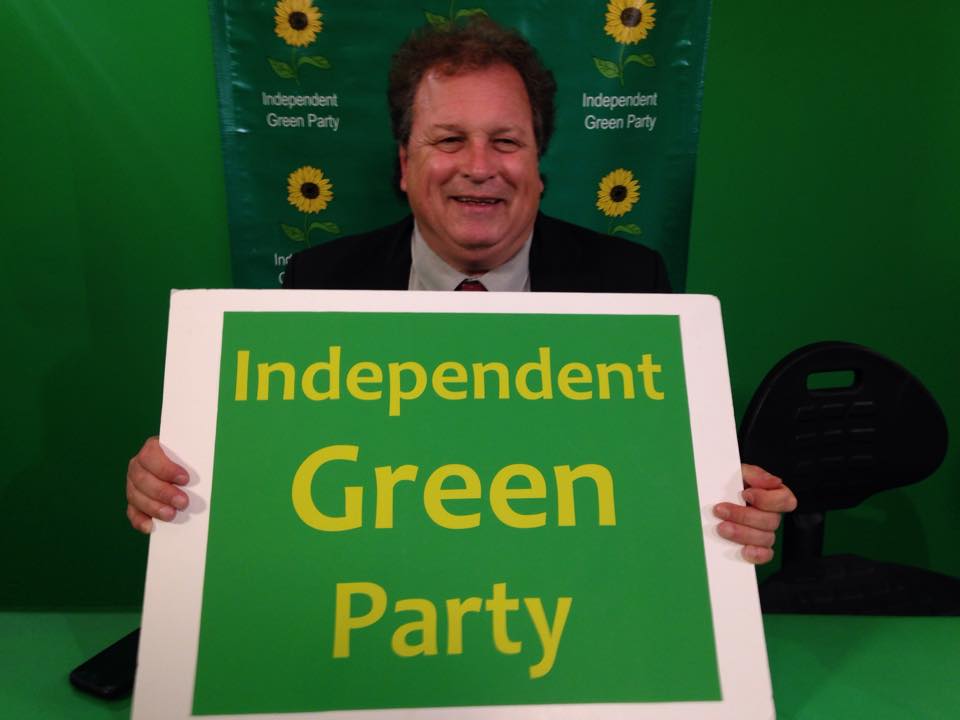 Man holding sign that says Independent Green Party