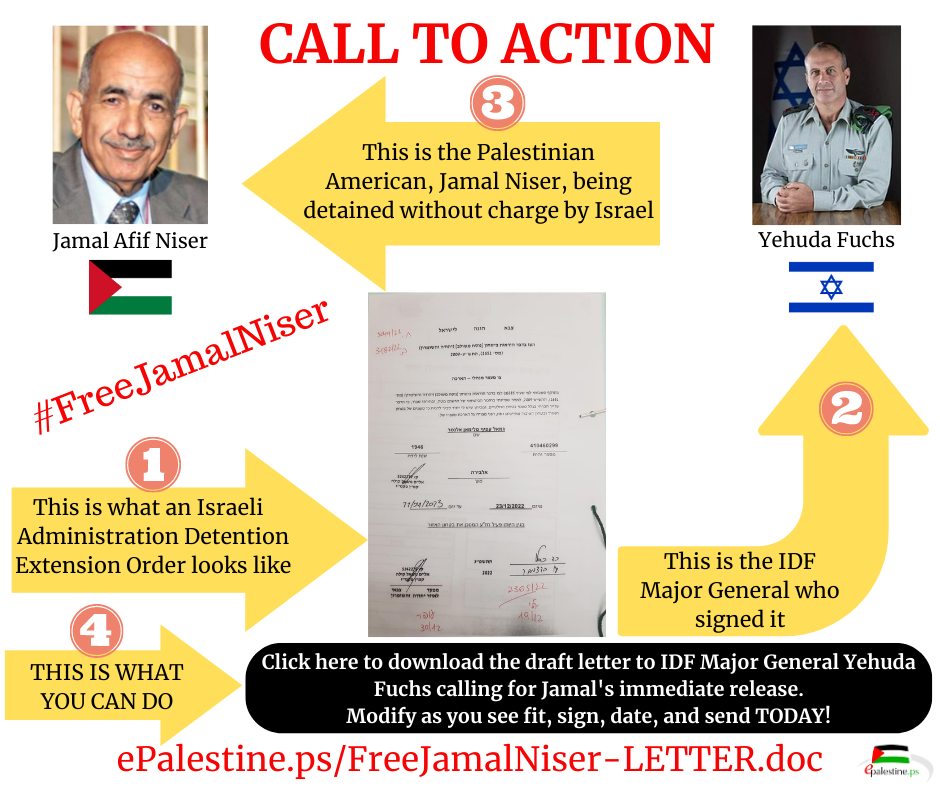 Support freedom for Jamal Niser, Palestinian-American businessman illegally held by Israelis in Administrative Detention. He is diabetic and has lost half his eyesight. He has not been charged and there's no reason for his detention. He is from Ohio and his release date was just extended by four months.