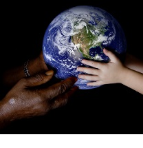 Black hands at left and white hands at right both holding an Earth globe in the middle