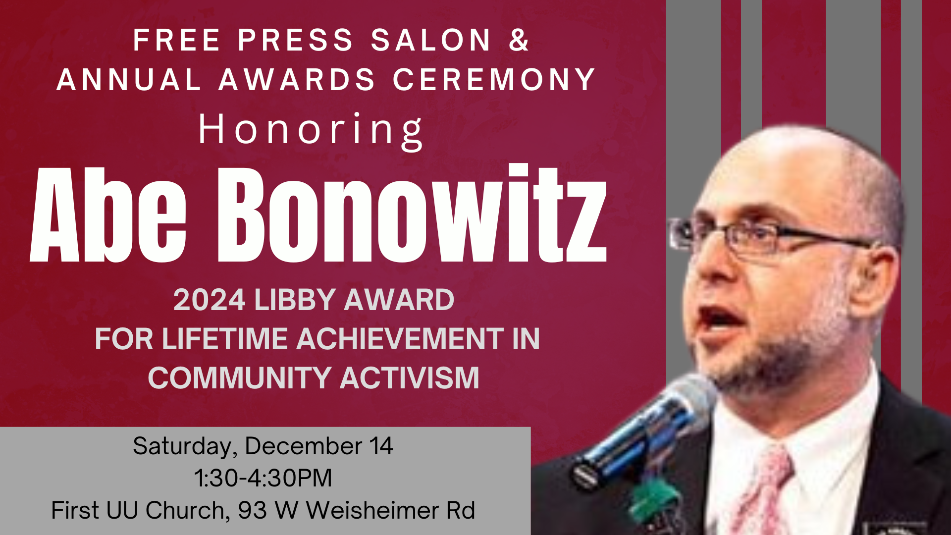 We will honor Abe Bonowitz of Death Penalty Action with the 2024 Free Press Libby Award for Community Activism and hear updates about the abolition of capital punishment and celebrate the 90th birthday of Tekla Taylor-Lagway!