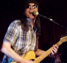Man with long brown hair in plaid shirt playing a guitar and singing into a mic