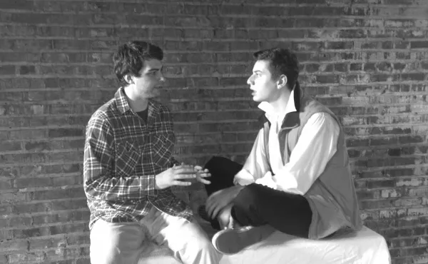 Galen Roth (left) as Joseph and Daniel Shtivelberg as his brother, Charles, in Evolution Theatre Company’s production of Sons of the Prophet (photo by Skylar Branstool)