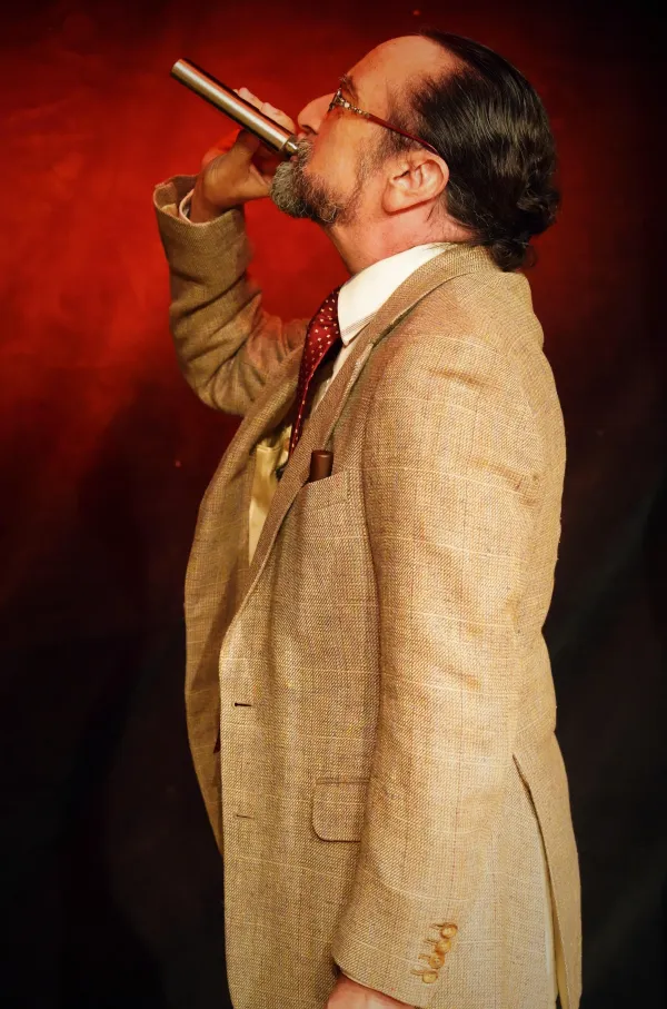 Playwright Willard Manus’ The Funny Man is a one-man show starring Sam Aaron as the Oscar-winning humorist S. J. Perelman, who The New York Times called “an artist whose nonpareil gift of ridicule, dazzling verbal effects, polished style, and keen observation made him a unique and precious figure in our literature.” The conceit of this solo show is that Perelman has been invited to the University of California at Santa Barbara in order to deliver a lecture on creative writing in 1976, when the screenwriter/playwright/author/essayist was 72. The Brickhouse Theatre’s stage is adorned by Zad Potter with a lectern, from which Aaron as the ersatz Perelman holds forth on the literary life, as well as Hollywood, Broadway, comedy, monogamy, travel, The New Yorker magazine and about what one suspects is the guest lecturer’s favorite subject: Himself.