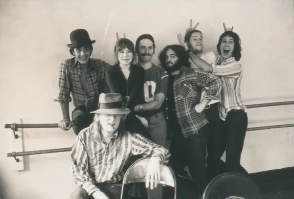 Garry Goodrow, Alice Peyton, Christopher Guest, John Belushi, Peter Elbling, Chevy Chase (from left) and Tony Hendra (front) in Drunk Stoned Brilliant Dead (photo by Michael Gold/courtesy of Magnolia Pictures)