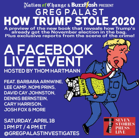 Today, Saturday April 18, we’ll be hosting a special Facebook LIVE Event to preview Palast’s new book, How Trump Stole 2020, which reveals how Trump’s already got the November election in the bag — unless we snatch it back! The event will feature exclusive reports from the scene of the crime — plus interviews with Barbara Arnwine, Lee Camp, Nomi Prins, David Cay Johnston, Dennis Bernstein, Cary Harrison, Josh Fox & more. Presented by Nation of Change, BuzzFlash and 7 Stories Press, and hosted by Thom Hartmann, the action kicks off on our Facebook page at 1 PM PT / 4 PM ET. We’ll also embed the feed here for those who want to tune in but don’t have an account.