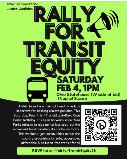 ABOUT: Transit Equity Day is a national event in its sixth year, a unique collaboration among labor, environment and social justice advocates. Transit Equity Day in Columbus is sponsored by The Ohio Transportation Justice Coalition, a statewide coalition of environmental, labor, and social justice groups, including Ohio Sierra Club, Sunrise Columbus, Columbus DSA, Transit Columbus, SEIU Local One, Friends and Families for Safe Streets Columbusm and transit riders across the state.