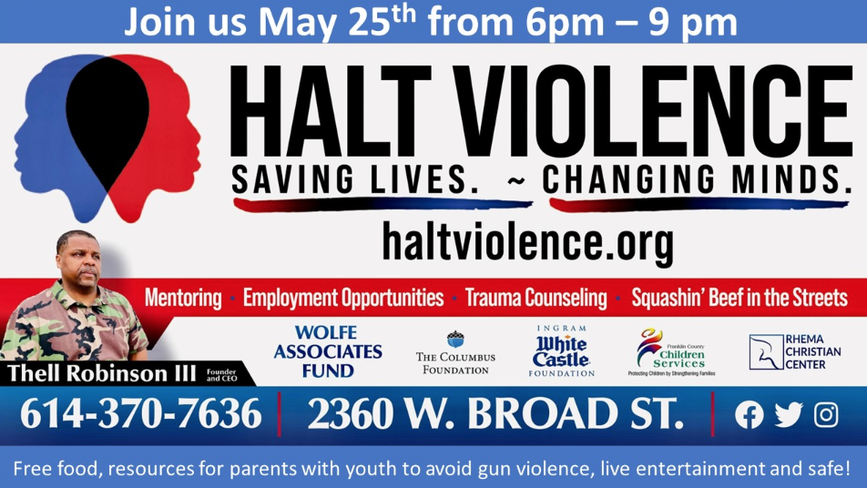 Thursday, May 25, 6-9pm, Halt Violence [Hilltop location], 2360 W. Broad St.