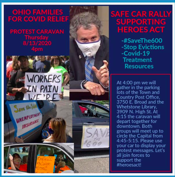 At 4:00 pm we will gather in the parking lots of the Town and Country Post Office, 3750 E. Broad and the Whetstone Library, 3909 N. High St. At 4:15 the caravan will depart together for downtown. Both groups will meet up to circle the Capital from 4:45-5:15. Please use your car to display your protest messages. Let’s all join forces to support the #heroesact! With the extra $600 weekly unemployment payments and eviction moratoriums expired, Congress has left for recess. President Trump’s executive orders do not hold water. The country needs a comprehensive plan to address our needs during the pandemic. On Thursday, August 13th, Ohio Families For Covid Relief will join concerned citizens in a caravan rally around the statehouse. Participants plan to demonstrate their support for the Heroes Act while safely circling in protest-adorned vehicles. People's lives are hanging in the balance. The economy stands on the edge of an even deeper collapse if a relief package is not passed. If we don’t act now, it isn’t just the unemployed families who will suffer. It will be every single person in the US. A coordinated federal relief package must also address the enormous costs of fighting the virus. That's why the time has come to unite together and stand up to say with one voice, pass the Heroes Act.