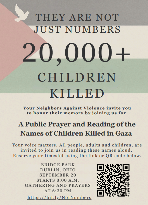 We are holding a continuous reading of the names of the martyred children in Gaza. Volunteers are invited to sign up for one or more reading slots. Prayers will be held in between readings.