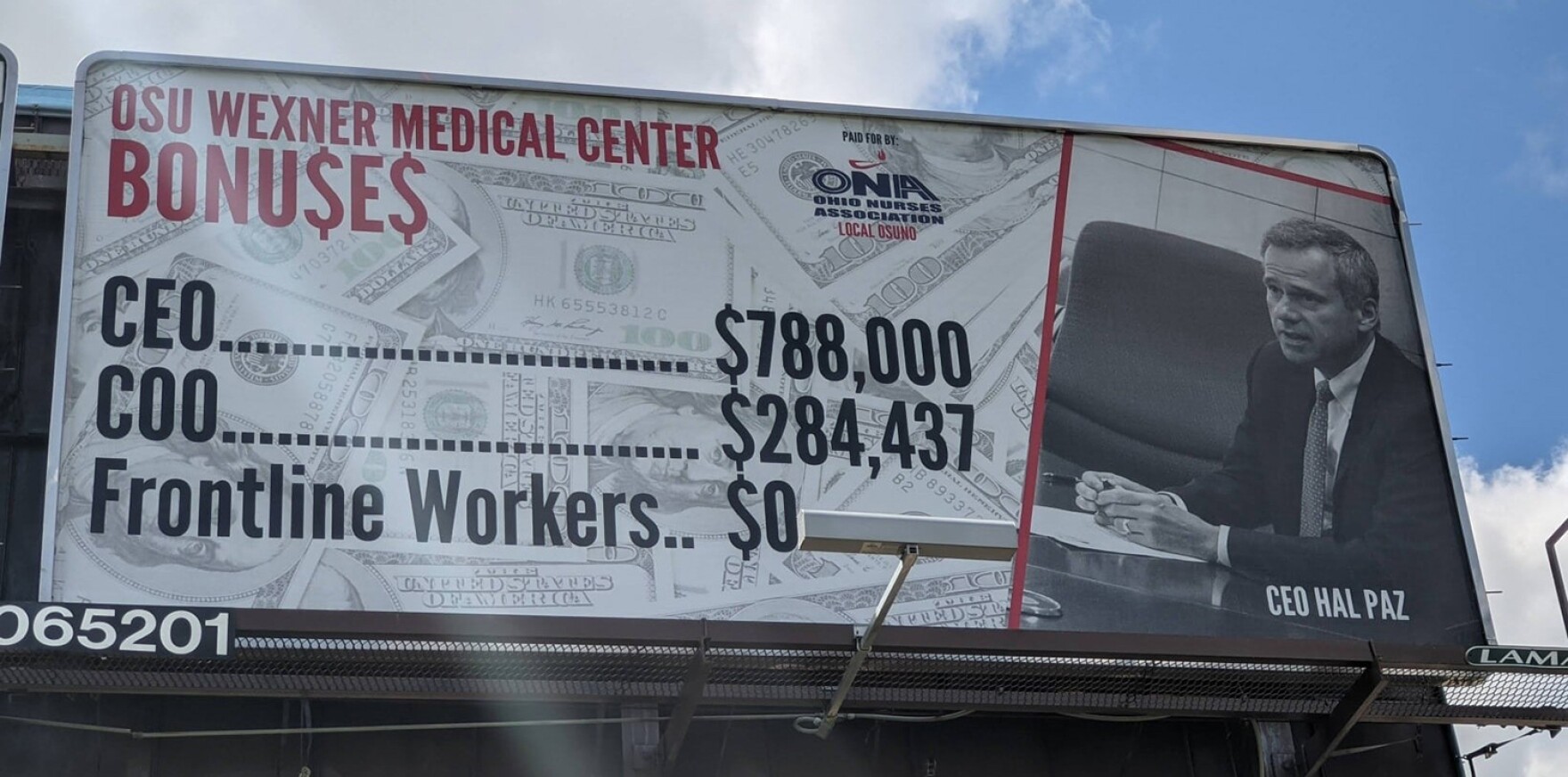 Coincidentally, the Ohio State University Nurses Organization (OSUNO) back in October purchased billboard space highlighting how CEO Dr. Hal Paz received a $788,000 bonus in 2020.