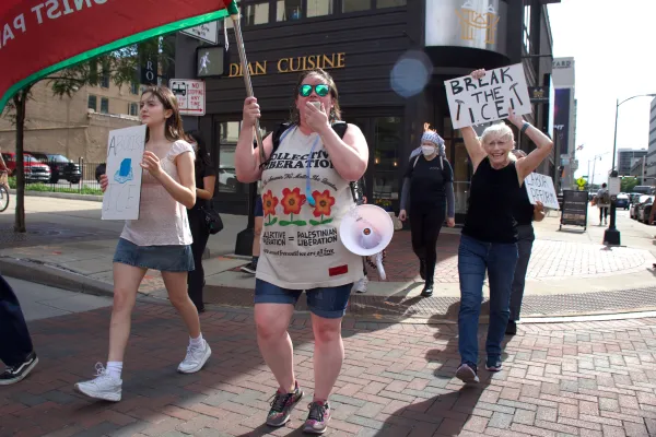 Protestors walked with signs and chanted “Stop ICE” at specific intersections near parking garages where workers were leaving their jobs at 5:00 PM. Protesters loudly voiced phrases such as “Say it Loud. Say it Clear. Immigrants are Welcome Here,” and “No ICE. NO KKK. No Fascist USA.”