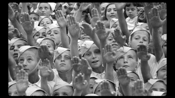 It's interesting to ponder that Cecchetti swung from one political extreme to the other, from far right to far Left. What’s the difference in the cinematography? How do the adoring Albanian masses who swarm (presumably) Enver Hoxha differ from the Italian mobs who worshipped Mussolini? A discerning eye can find a major difference in how the Albanians appeared under Italian rule and then after the country’s liberation by the partisans from fascism: Once the Communists take power, many more members of the Albanian masses wear traditional national costumes. Their ethnicity isn’t suppressed as one supposes it would be under foreign occupation and Albanians seems freer to be their authentic cultural selves.