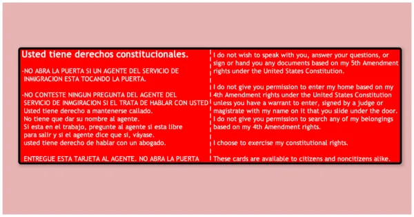 La “Tarjeta Roja” a continuación es uno de muchos recursos disponibles para que los inmigrantes tomen conciencia de sus derechos. La Unión por las Libertades Civiles Americanas (ACLU) es una asociación de abogados progresistas, y declama a los cuatro vientos que: “Recalcamos que los individuos cuentan con derechos constitucionales, independiente de su estado migratorio”.