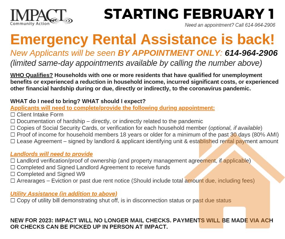 Impact Emergency Rental Program (ERA) will re-open tomorrow, February 1, BY APPOINTMENT ONLY. Please see the attached flyer for details on this year's rental program and how you may qualify.