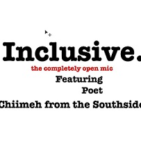 White background and words in black saying inclusive the completely open mic featuring poet Chiimeh from the Southside