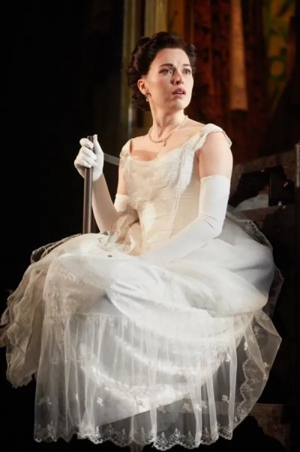 another kind of “character” that appears onstage - the posh house inhabited by the elite Birling (rhymes with “pound sterling” - which rhymes with Rod Serling) family. What befalls this house of upper class Brits is “Supernatural Realist” symbolism of class war and rather ingenuously rendered. One is tempted to say that designer Ian MacNeil should be credited as a member of the cast, not the crew, because the house he has wrought is a “co-star” doing some of this production’s best “acting.” Calls has evocative stagecraft and ambiance, including the best lamppost I’ve ever seen grace the boards.