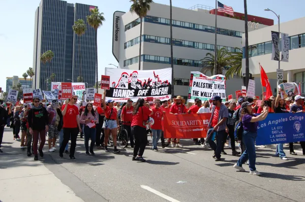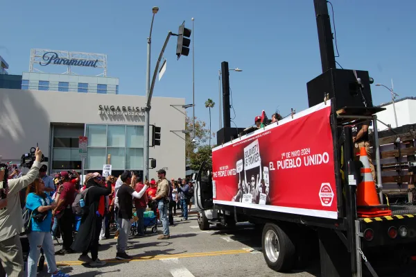 Earlier that May 1 I went to the May Day rally at Sunset Blvd. where hundreds of pro-union demonstrators, many of them Latino, listened to speeches from leftists and labor activists. The throng was beneath a huge sign for Paramount Pictures, and after about an hour of pro-working class, pro-immigrant and antiwar remarks, they marched up to Hollywood Blvd. and down the Fabled Walk of Fame, joined by colorful Indigenous Aztec dancers and an African drum group.