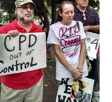 Man with gray beard and sunglasses wearing a baseball cap holding a sign that says CPD out of control standing next to an older woman with gray hair pulled back in a ponytail looking down at the ground, very sad, wearing a white T-shirt with words "RIP Donna" on it and holding a sign with pictures of a young woman on it