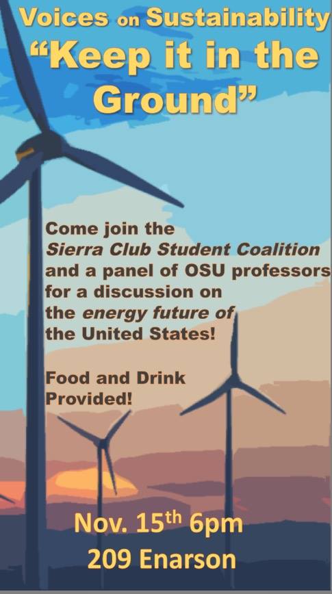 The Ohio State Sierra Club Student Coalition is hosting a Voices on Sustainability event! We have invited professors, politicians, and scholars to discuss issues regarding the future of our energy sources, sustainability methods, and how we can come together as a community to solve these problems. There will be food and drinks provided! We hope to see you there!