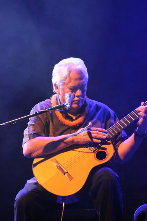 While Kapono sported a more pop persona and sound, Keola Beamer was, relatively speaking, “kanak to da max” with his Hawaiian style garb, banter between tunes, and above all his choice and execution of music, sometimes accompanied with hulas danced by Moanalani. Keola alternately played two different acoustic guitars - but not only strumming them. Rather remarkably, he sometimes used them as percussive instruments, pounding or rather tapping out rhythms. The delighted aud was treated to this virtuoso “guitar-manship” (to coin a term), raptly watching as well as listening to him. This hard working musician be a living master of slack key guitar, but he’s no slacker!