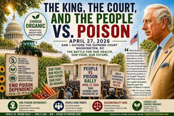 King Charles III, a global leader for regenerative organic agriculture and ambassador for nature, arrives in Washington, DC as the Supreme Court hears Monsanto Co. v. Durnell, and the people rally.