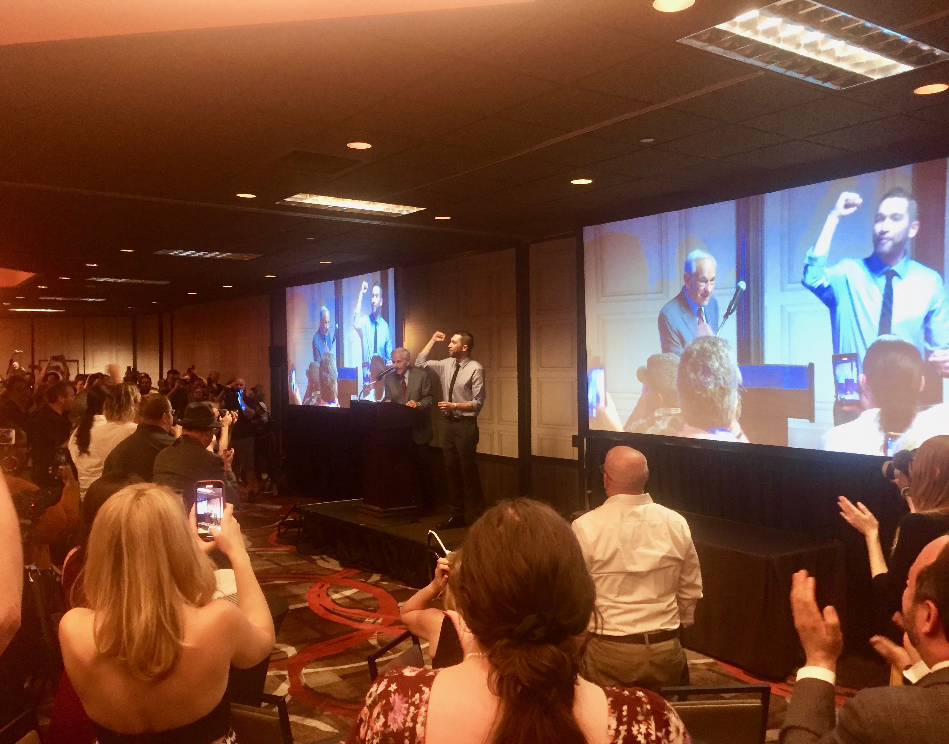 Comedian Dave Smith and former Congressman Ron Paul address members of the Mises Caucus in Reno, Nevada during the Libertarian National Convention. Photo by Travis Irvine.