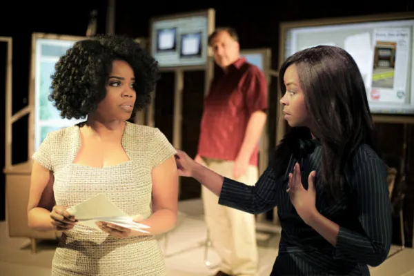 Dust is excellently acted and well directed by Desean Terry, who has previously helmed Rogue Machine’s outstanding Gunshot Medley: Part 1 and Les Blancs, as well as James Baldwin’s Blues for Mr. Charlie. Jenrette has been Emmy nominated for The Handmaid’s Tale, while Tazel has dazzled viewers on FX’s Justified and in Roots, so in addition to Pasqualini, this three-hander provides audiences with stellar performances. Scenic designer Mark Mendelsohn’s set, which is generally divided between Beverly’s office on stage right, and Denitra’s home on stage left, also merits mention, as do projection designer Sean Cawelti’s images, seen on eight big screen TV’s that enhance our sense of place and, at times, history (such as with shots of 1967’s Newark Rebellion).