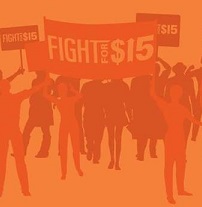 Orange drawing of lots of people standing and holding signs that say Fight for $15
