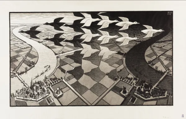 The artist described the effect the Alhambra had on him as triggering his “first attempt to systematize.” This abstract tessellation galvanized Escher’s technique for his etchings, sketches, etc., with an increasingly mathematical – if quirky – aesthetic, which he applied to “recognizable” subjects, such as birds and fish, that seemed to have no beginning or end. The Dutchman was also “smitten by the music” of Bach, impressed by the rhythmic structures of the Baroque compositions. To paraphrase Shakespeare, there was indeed “a method to [Escher’s] madness.”
