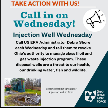 Phone script for out-of-state residents: “Hi, this is (insert name), I live in (insert city, state), and I’m calling today in support of Ohio Environmental Justice Community request that Administrator Shore begin actions to remove Ohio’s authority to manage the class II oil and gas waste Injection well program. The program, managed by the Ohio Department of Natural Resources (ODNR), continues to endanger underground drinking water sources and public health.”