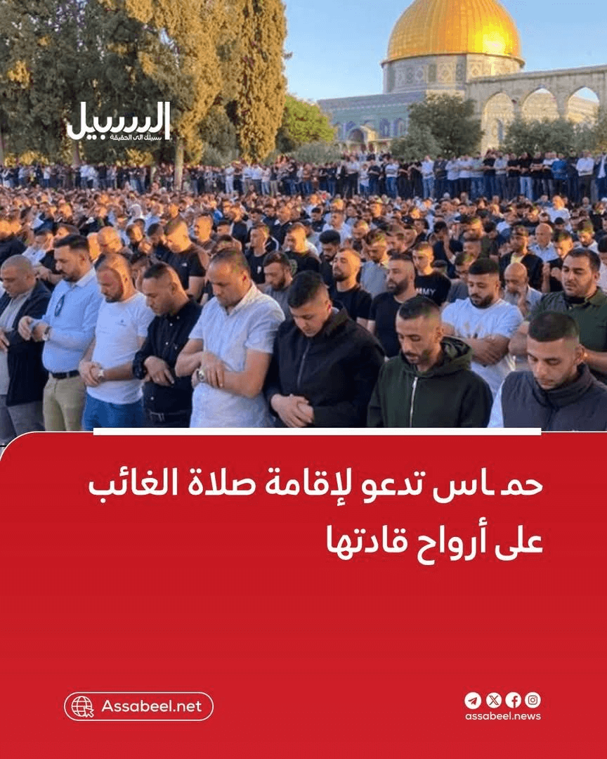 After the Islamic Resistance Movement (Hamas) called on the Palestinian people and the Arab and Islamic nations to perform the funeral prayer in absentia for the souls of its martyred leaders after Friday prayers in all mosques in Palestine and Islamic centers around the world.
