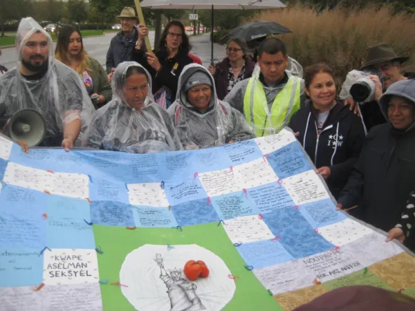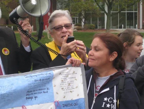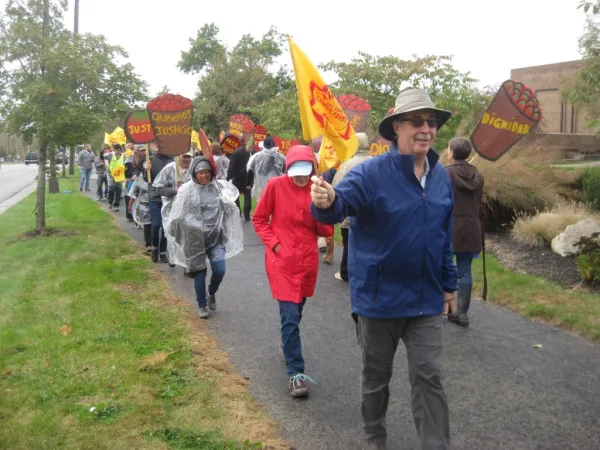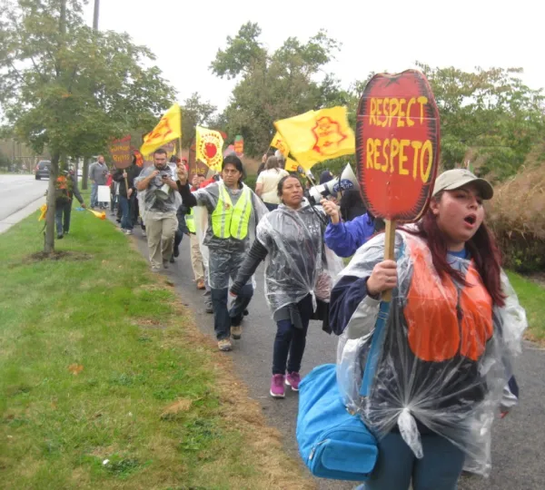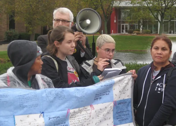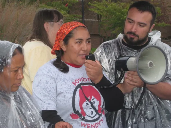 On October 23, women of the CIW led a protest in the rain outside Wendy’s Dublin headquarters to raise awareness of widespread sexual harassment and rape in Mexican agribusinesses, where Wendy’s now sources tomatoes and other produce. They were joined by faith communities and members of the Student/Farmworker Alliance (SFA) at Ohio State University.