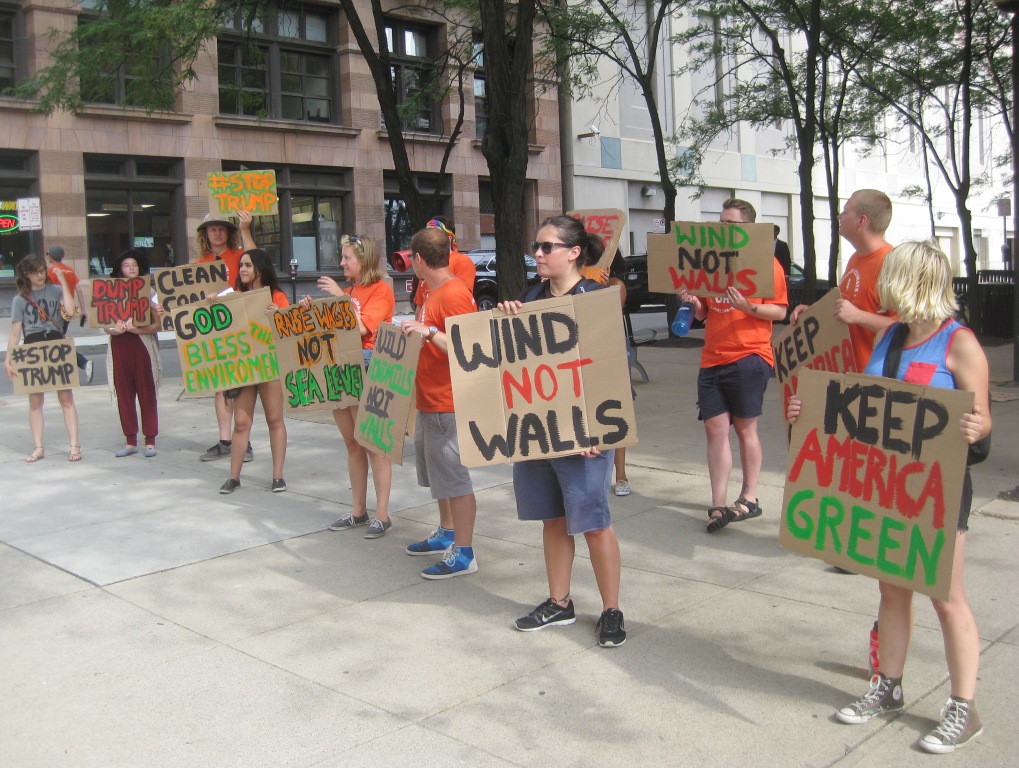 On July 21, the last day of the Republican National Convention, activists across the nation rallied at the offices of Republican politicians and corporations sponsoring the RNC to denounce the racism, xenophobia, and misogyny expressed by Donald Trump. In Columbus the focus was primarily on Trump’s disdain for green energy.