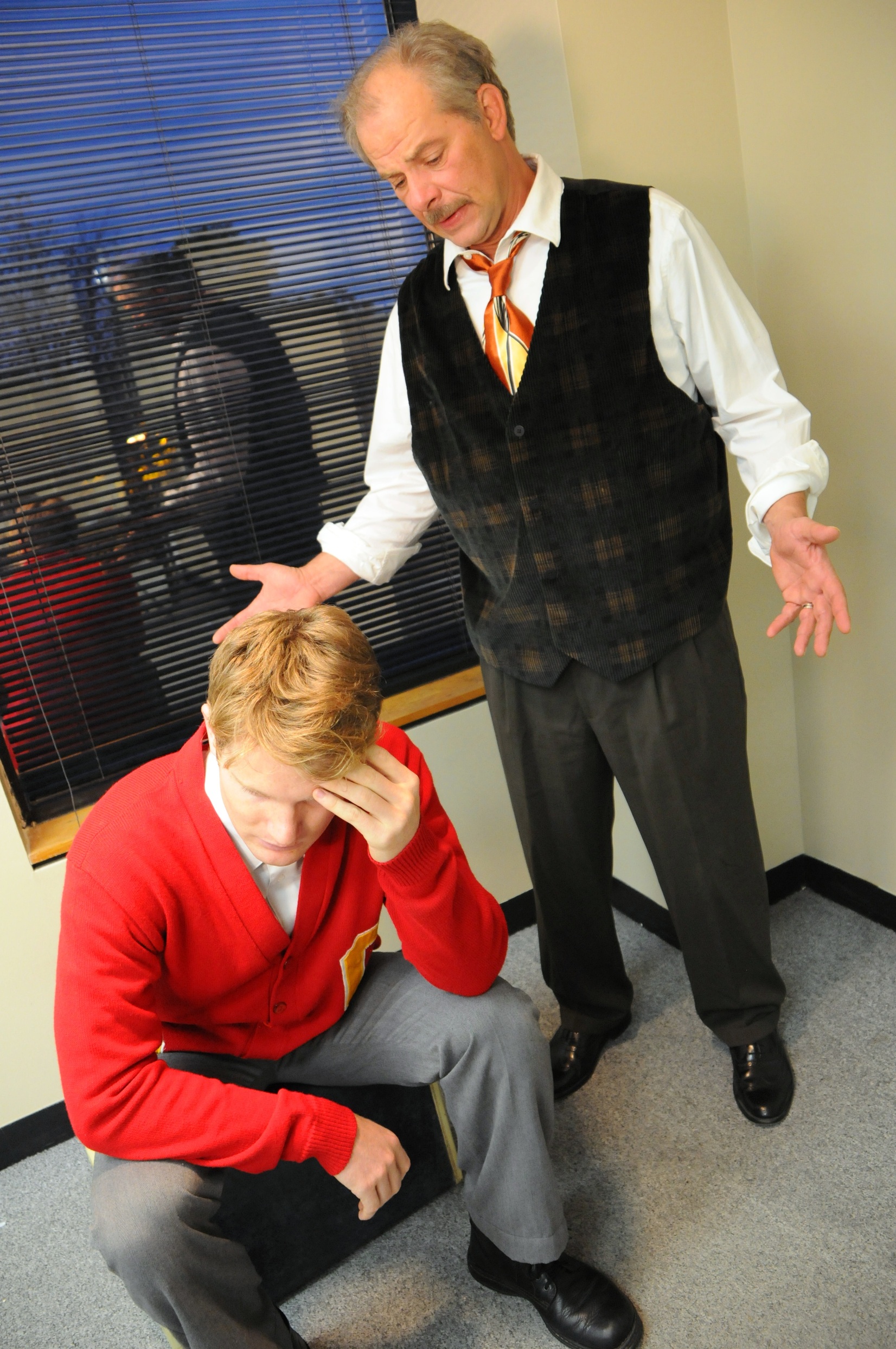 Willy Loman (Mark Mann, standing) upbraids ne’er-do-well son Biff (Jay Hobson) in SRO’s production of Death of a Salesman (Dale Bush Photography)