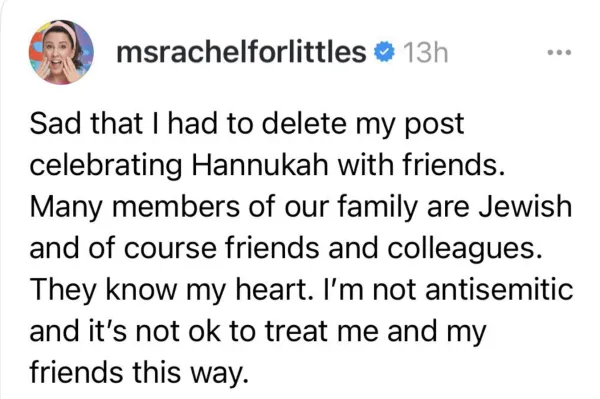 "All children have the right to food, water, medical care and education. All children should be protected from violence," Miss Rachel wrote on Instagram at the time of StopAntisemitism's complaint. I don’t understand how this is so controversial. She is advocating for all children to be able to grow up whole and without severe trauma. How can advocating for not starving children be so controversial?! I pray for Ms. Rachel who does not deserve all this hate for wanting to help children! She is truly an angel in a world full of demons.