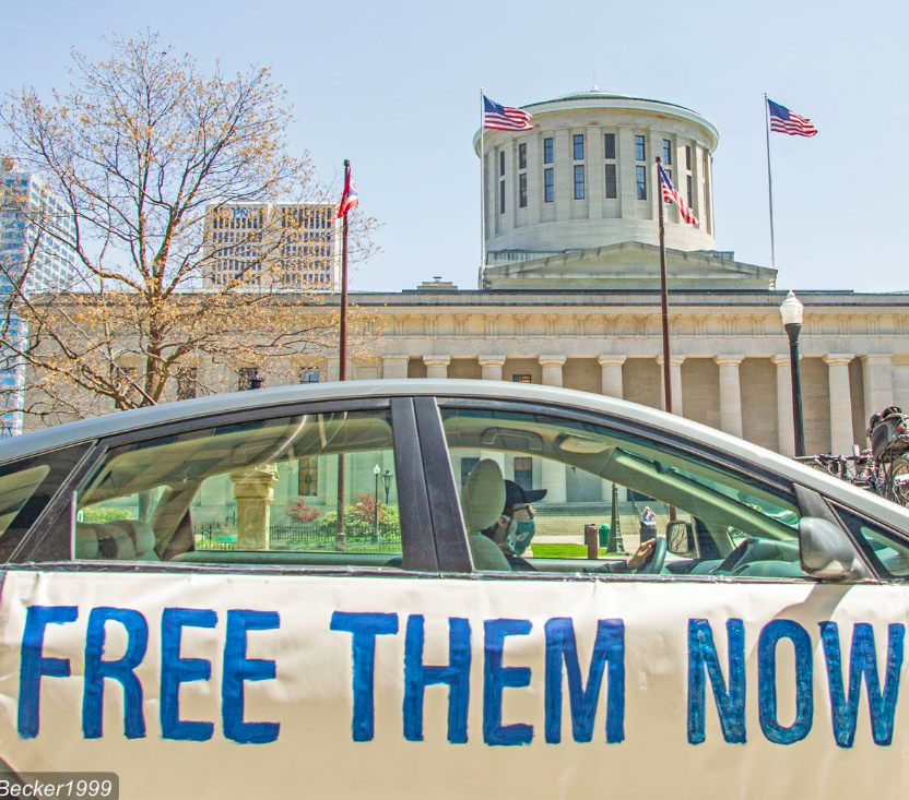 This weekend, families demonstrated outside of the Marion Correctional Institution, where more than 80% of the jail population has tested positive for COVID-19. On Friday, Ohio Prisoners Justice League and Ohio Organizing Collaborative organized a mass “COVID-safe car rally” and die-in to protest the lack of action on behalf of incarcerated people at risk of contracting COVID-19. View photos of the car rally and die-in from Paul Becker here.