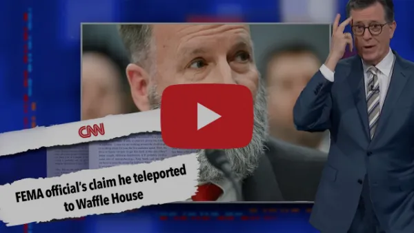 Dear Mr. Colbert, your take-down of Trump’s #2 at FEMA, Gregg Phillips, who claims he was tele-transported to a Waffle House was so hilarious I spit my milk out through my nose.