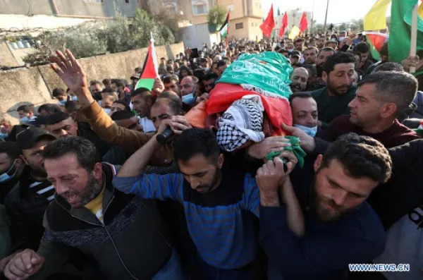 Mourners carry the body of Palestinian Atef Yousef Hanaysha during his funeral in the West Bank village of Beit Dajan, east of Nablus, on March 19, 2021. Atef Yousef Hanaysha was shot dead by Israeli soldiers on Friday afternoon in an anti-settlement rally near Beit Dajan village, medics said. (Photo by Ayman Nobani/Xinhua)