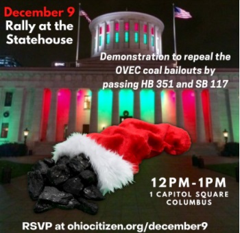 On Thursday, December 9 at 12:00 pm, we will meet at 1 Capitol Square, on the High Street side, in Columbus, to urge our legislators to pass SB 117 and HB 351, bipartisan legislation that will repeal one of the last pieces of corrupt House Bill 6 and refund money to consumers.