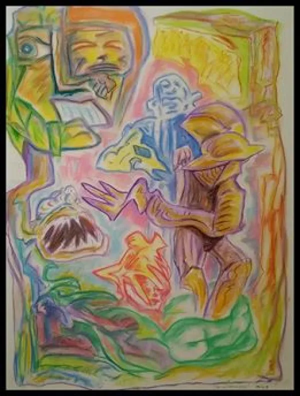 An early Beoddy cover cartoon for the Free Press showed a Columbus cop hitting a hippie in the head. Police harassment has been a re-occurring theme in his art and performances. In the 1990s when students in the OSU campus area created Cop Watch, Beoddy often led them with his prophetic poem “Attila the Pig.” The refrain involved group participation, as Beoddy chanted: