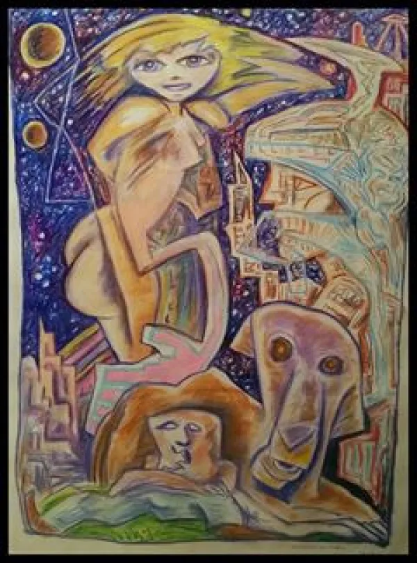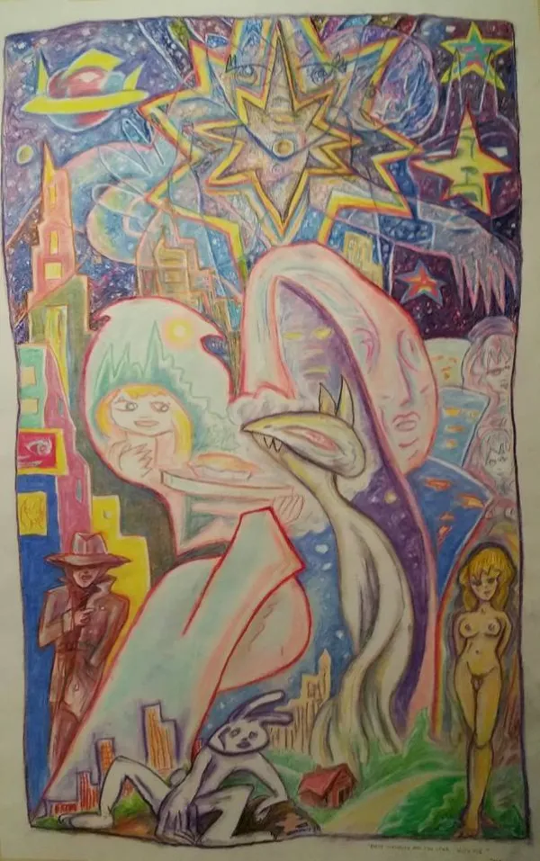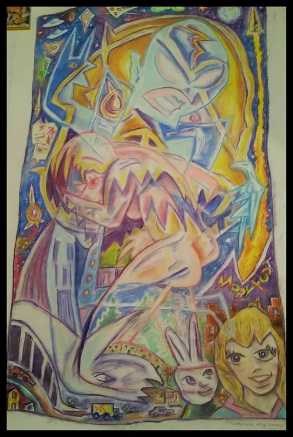 Beoddy’s newest art endeavor is what he describes as “surrealist abstraction, taking real things and making them abstract and real at the same time.” The new paintings are more pastel than his usual look, thanks to the influence of “Chimera,” the female character who collaborates with Jim with her own way of drawing. Chimera is a creation of Beoddy’s personality and her paintings derive from his left hand, lending a lighter, more colorful, “old hippie chick” vibe to his artwork.